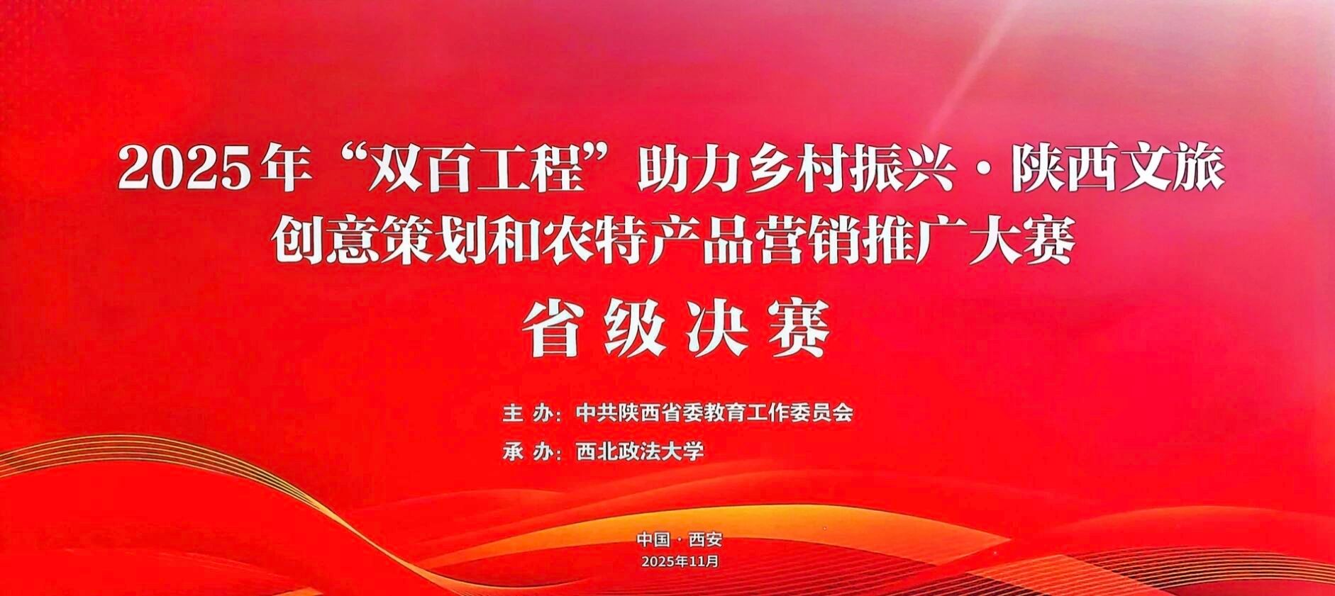近日,由中共陕西省委教育工作委员会主办、西北政法大学承办的2025年“双百工程”助力乡村振兴·陕西文旅创意策划和农特产品营销推广大赛圆满落幕。本次大赛紧扣时代主题,旨在引导高校学子深入服务地方发展,推动高校智慧与乡村振兴实践深度融合。经过校赛、省级选拔赛与决赛的层层选拔,我院参赛团队表现优异,在两个赛道中共斩获两项省级三等奖,充分展现了艺术与设计在服务地方、实践育人方面的扎实成效与创新活力。